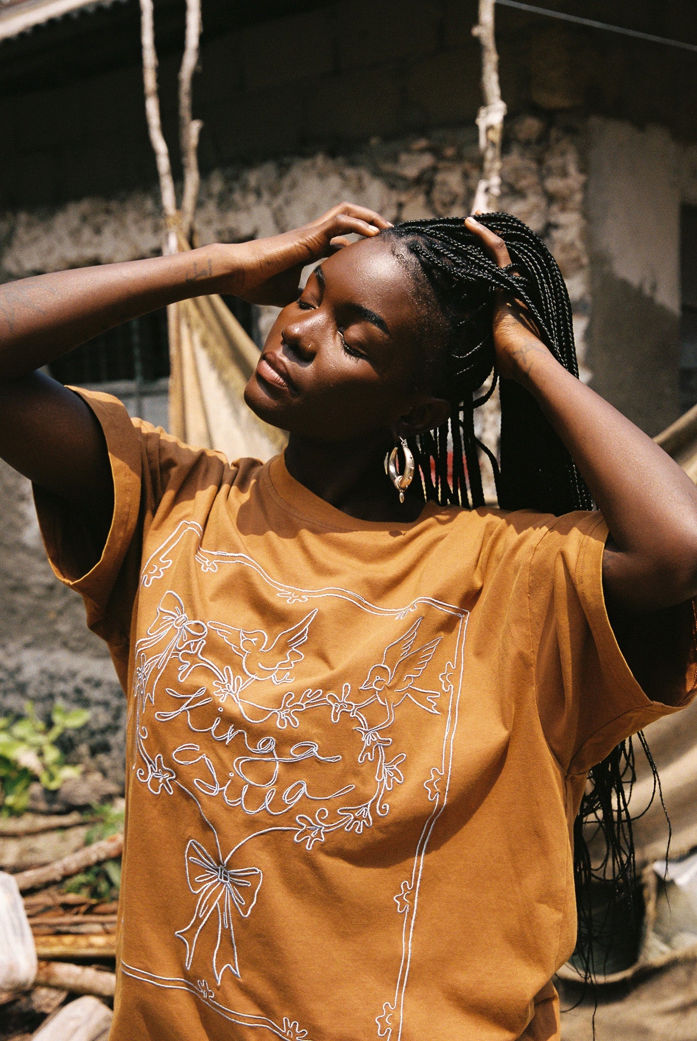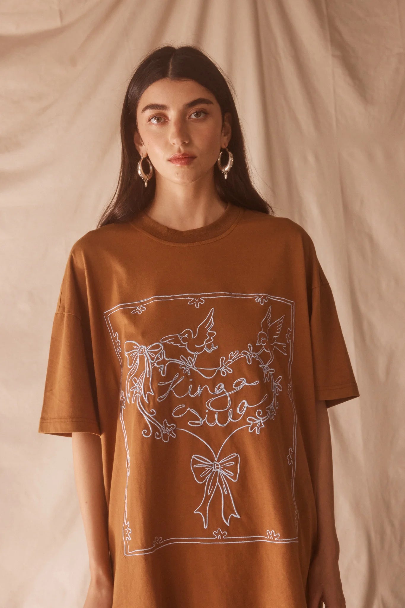 The Amante Tee is the signature KC shape with a romantic edge. Crafted from soft cotton jersey in a rich earthy tone, this oversized graphic t-shirt features a delicate linework illustration of doves, florals and ribbon motifs framing Kinga Csilla hand writing.