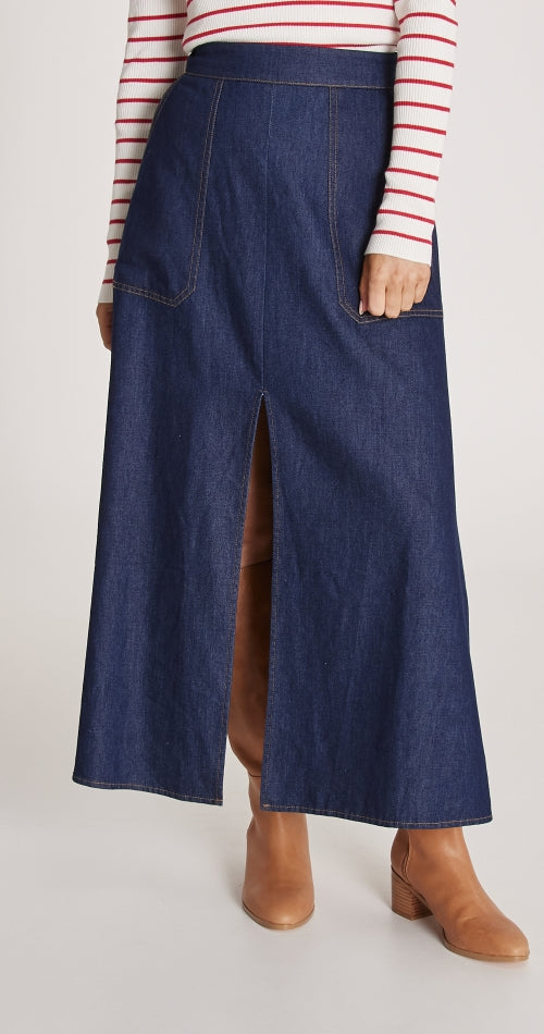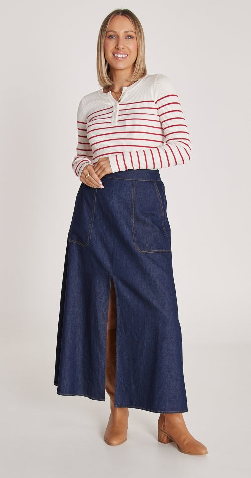 Classic denim skirts are back and the incredible ‘Arlo Denim Skirt’ in Dark Blue is the perfect piece to fill that wardrobe spot! Comfortable and versatile, this stunning skirt styles up and down easily with all of your wardrobe favourites. Features include, elasticated waist at back, side pockets, front split, tan stitching, all finished in a stunning dark blue wash. Pair this style with our 'Henley Top' in White Red Stripe for a cute seasonal look!