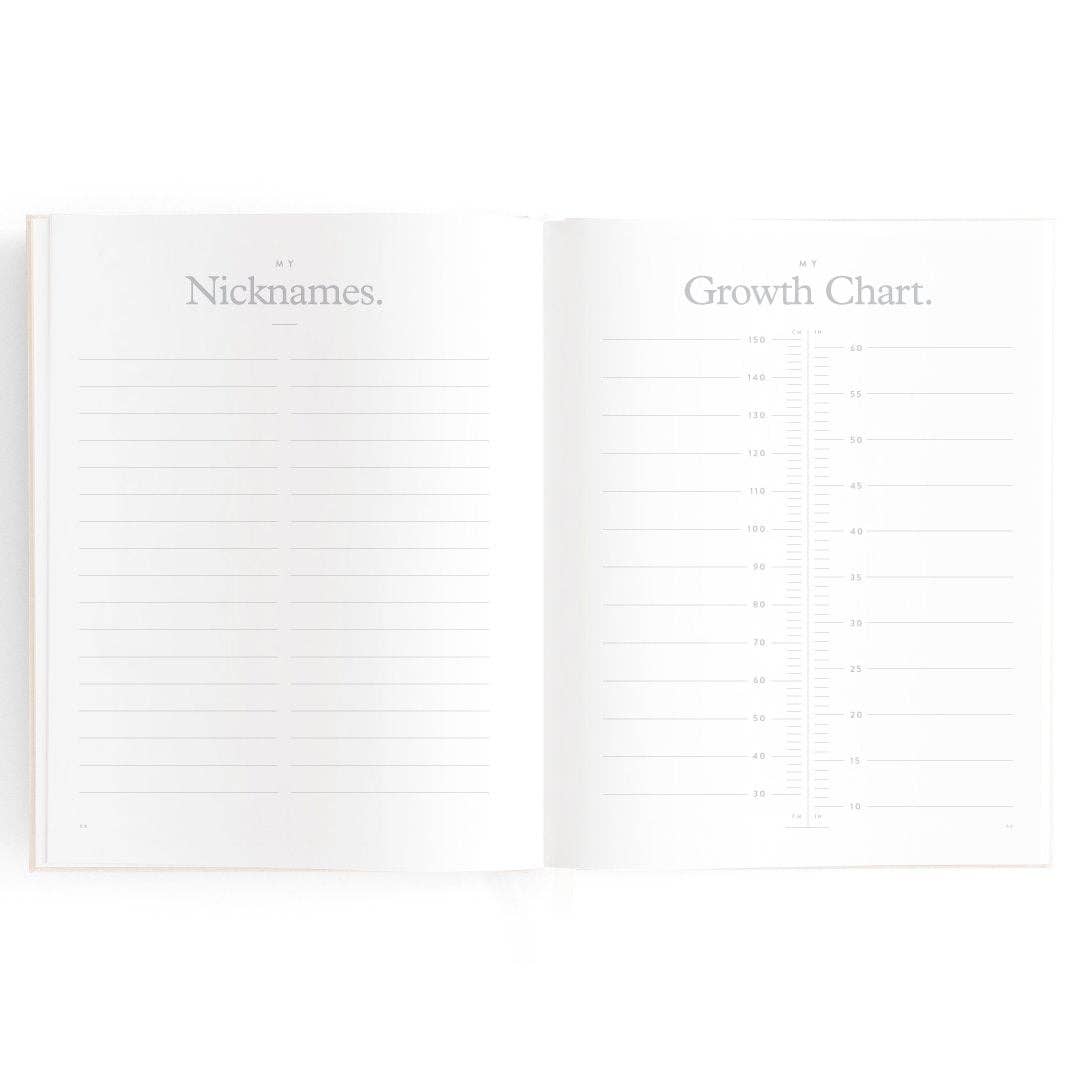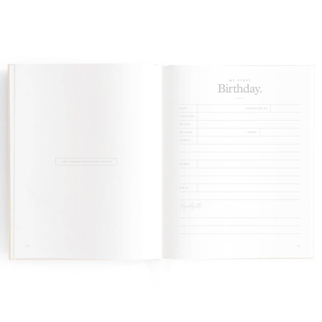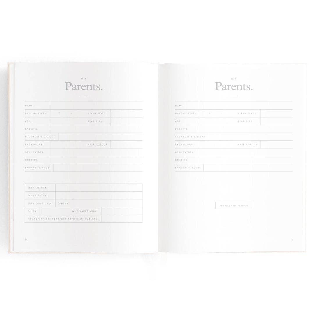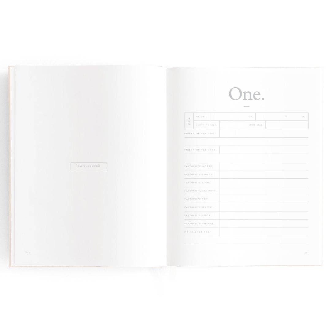 280 x 220mm / 11 x 8.6". A beautiful keepsake for the whole family to enjoy. Includes: important milestones and firsts, family profiles, family tree and travel map, playgroup and daycare through to kindy and school years, time capsule, nicknames and celebrations, pets, friends, birthdays and more. 160 pages. Gold foil stamped buttermilk (cream) linen cover. White grosgrain ribbon. 2mm foil stamped hard cover, lay-flat binding. Gold foil end pages and premium 115gsm FCS-certified acid-free paper. Packaged in a cello sleeve with gold foil bellyband. Designed in Australia, printed in China.