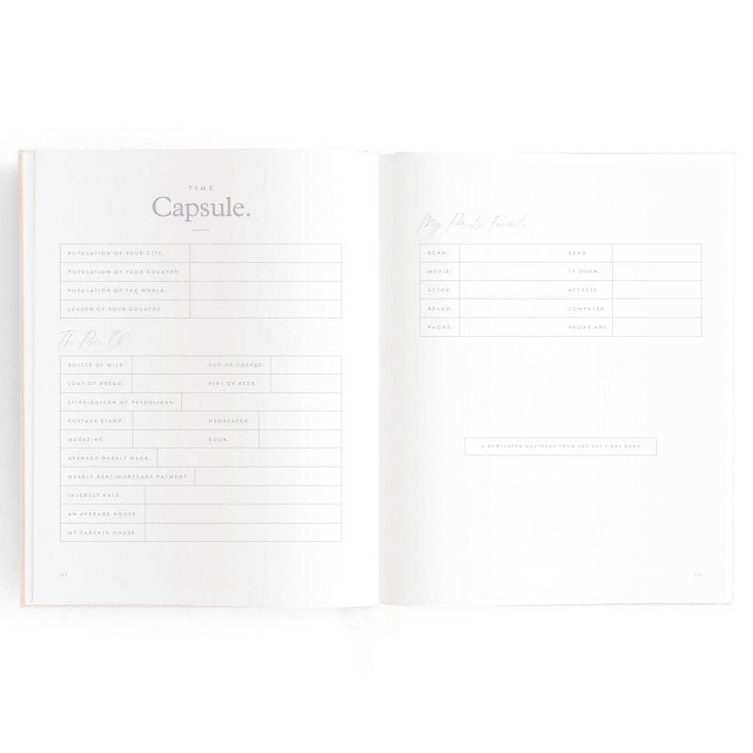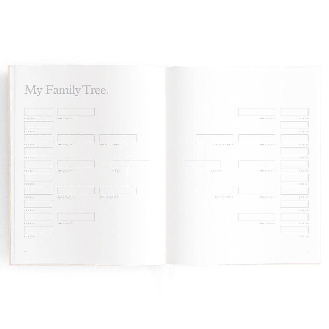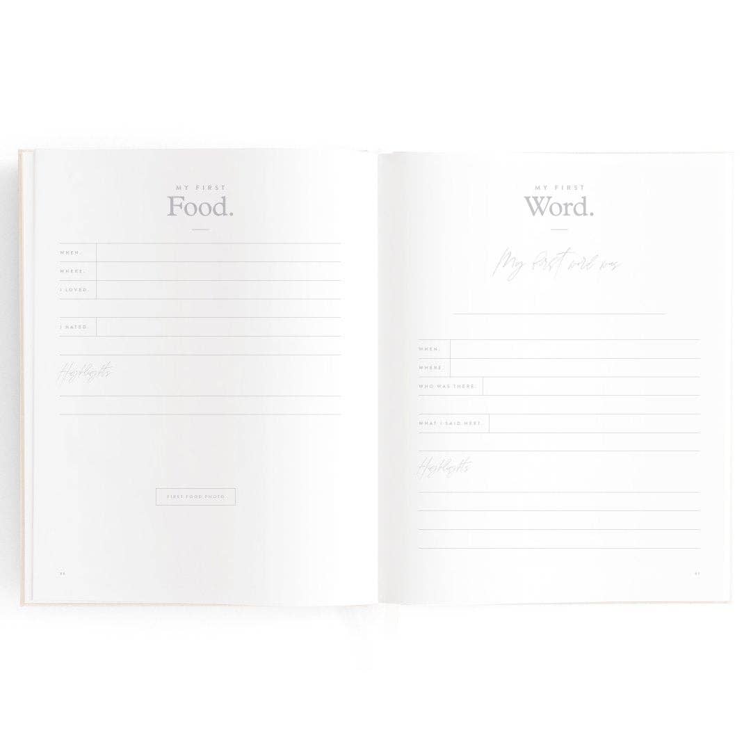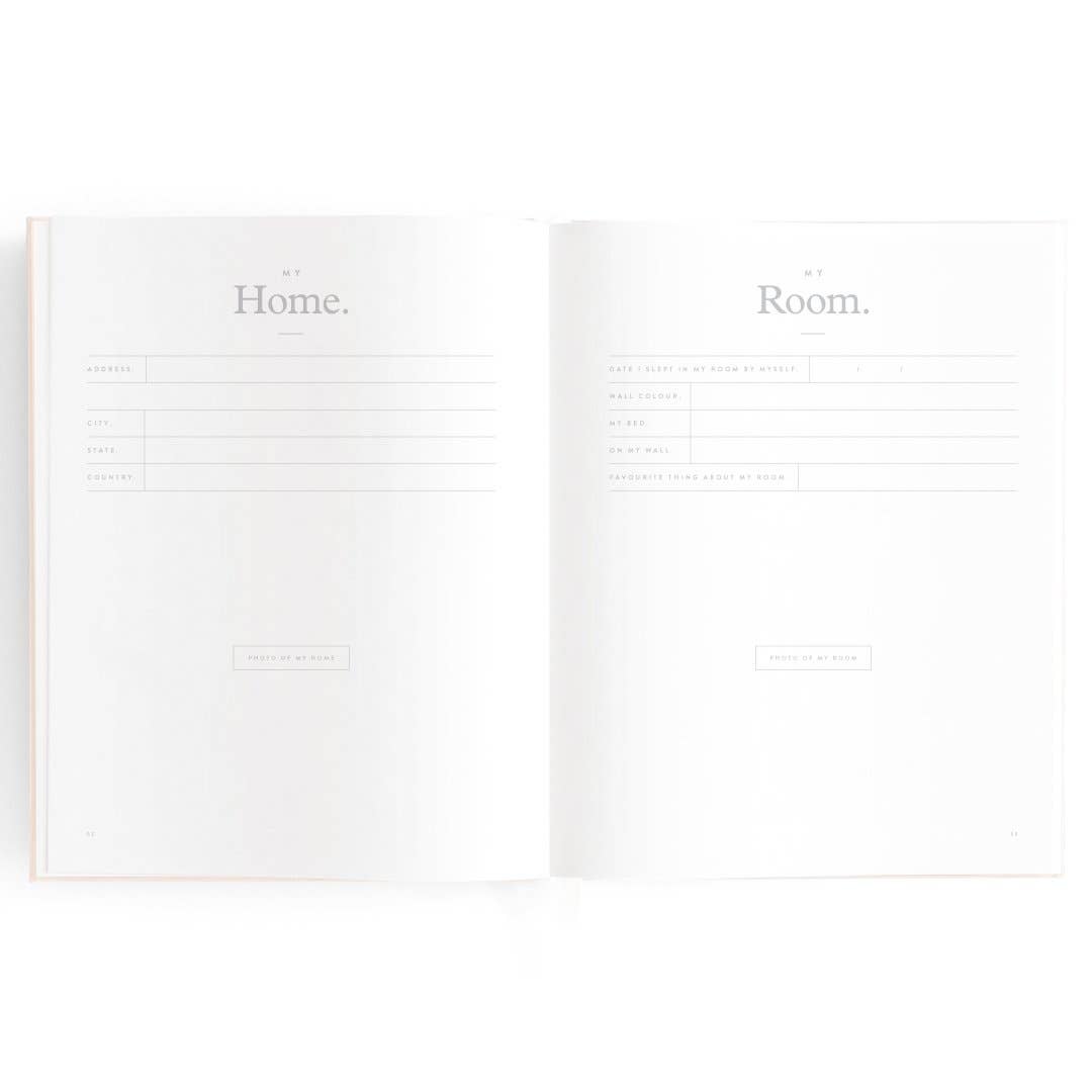 280 x 220mm / 11 x 8.6". A beautiful keepsake for the whole family to enjoy. Includes: important milestones and firsts, family profiles, family tree and travel map, playgroup and daycare through to kindy and school years, time capsule, nicknames and celebrations, pets, friends, birthdays and more. 160 pages. Gold foil stamped buttermilk (cream) linen cover. White grosgrain ribbon. 2mm foil stamped hard cover, lay-flat binding. Gold foil end pages and premium 115gsm FCS-certified acid-free paper. Packaged in a cello sleeve with gold foil bellyband. Designed in Australia, printed in China.