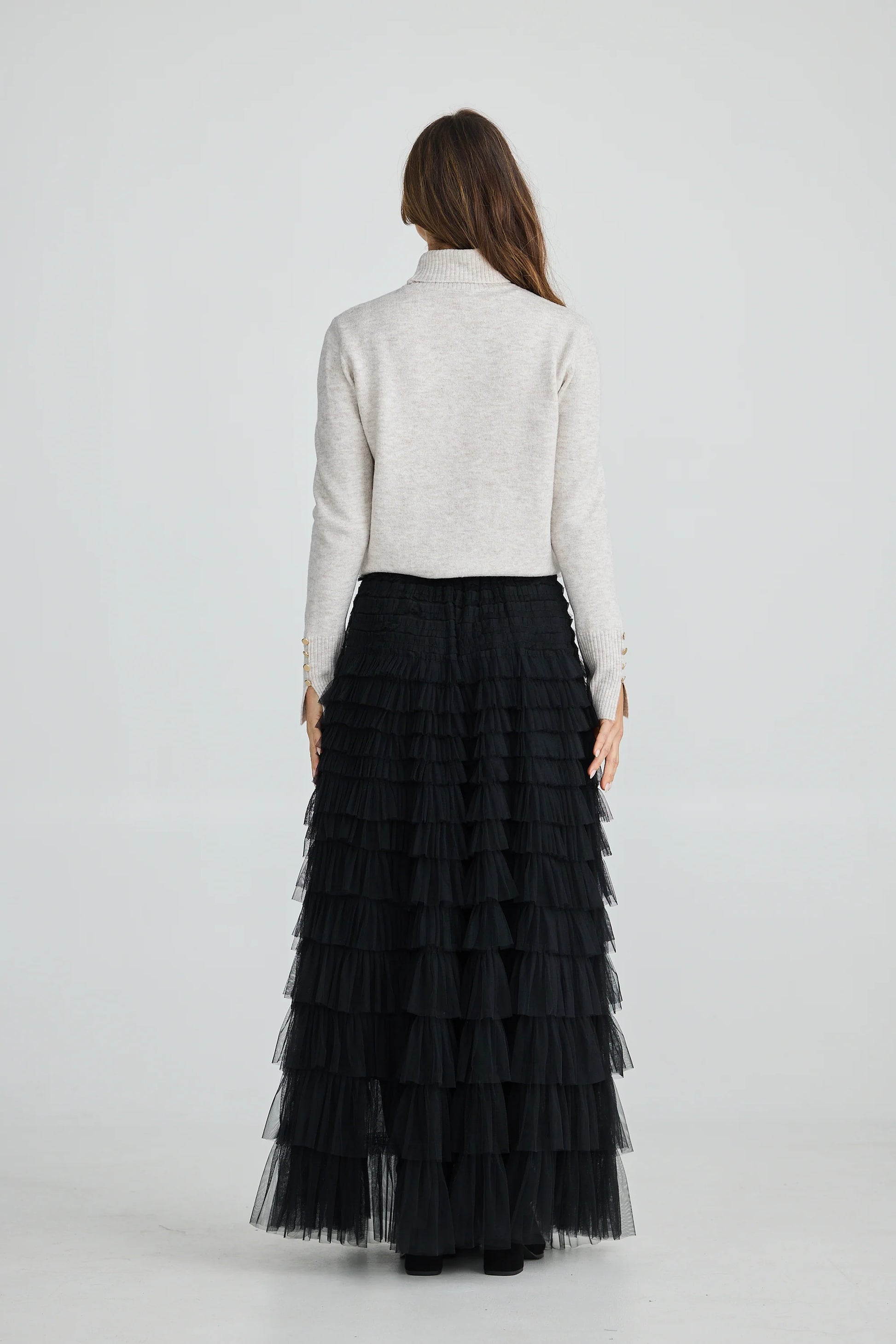 The beautiful new IT skirt! The Chance Skirt includes an elasticated waistband and is designed with multiple tiered layers of ruffled tulle, creating a dramatic and elegant maxi length. It is also fully lined for comfort and durability.