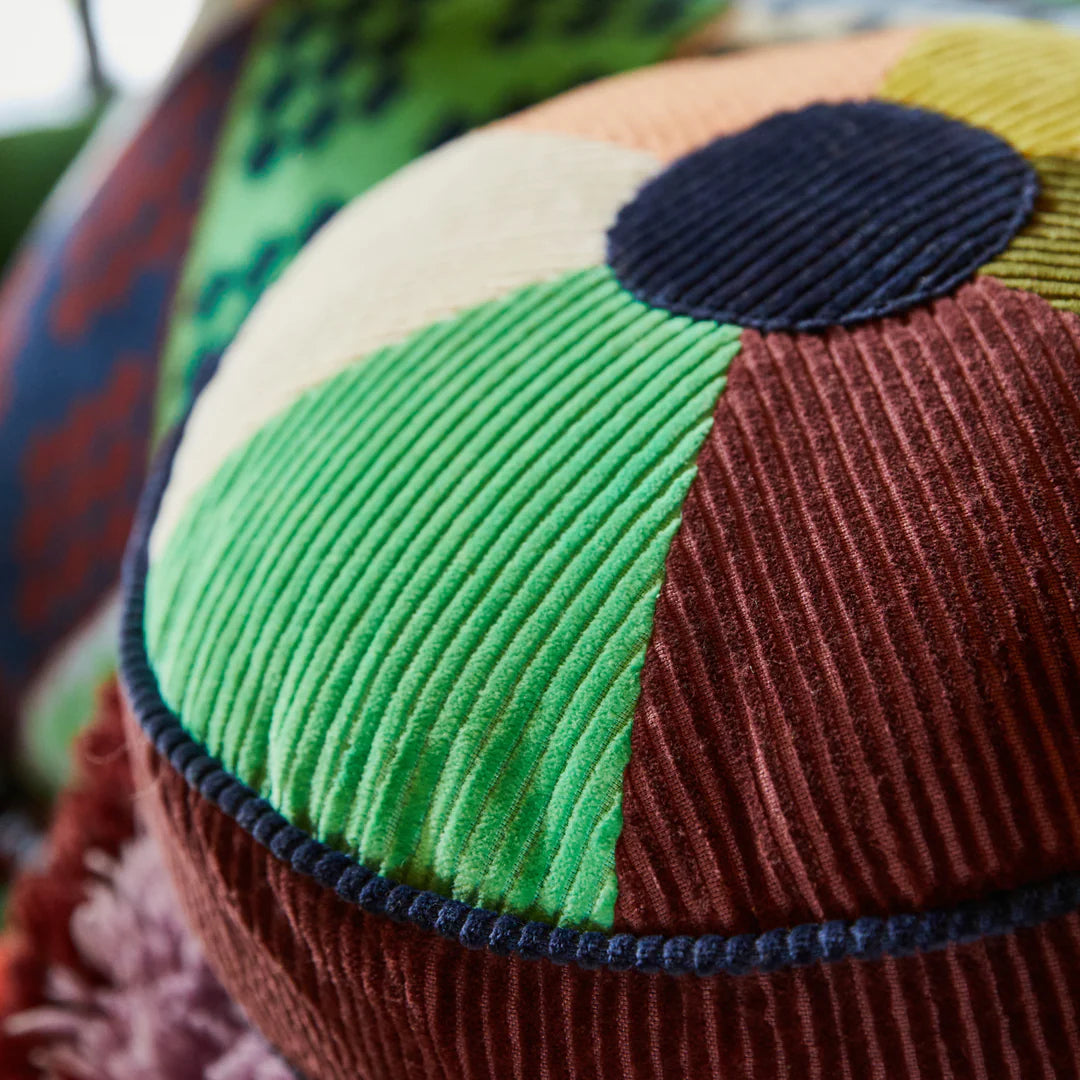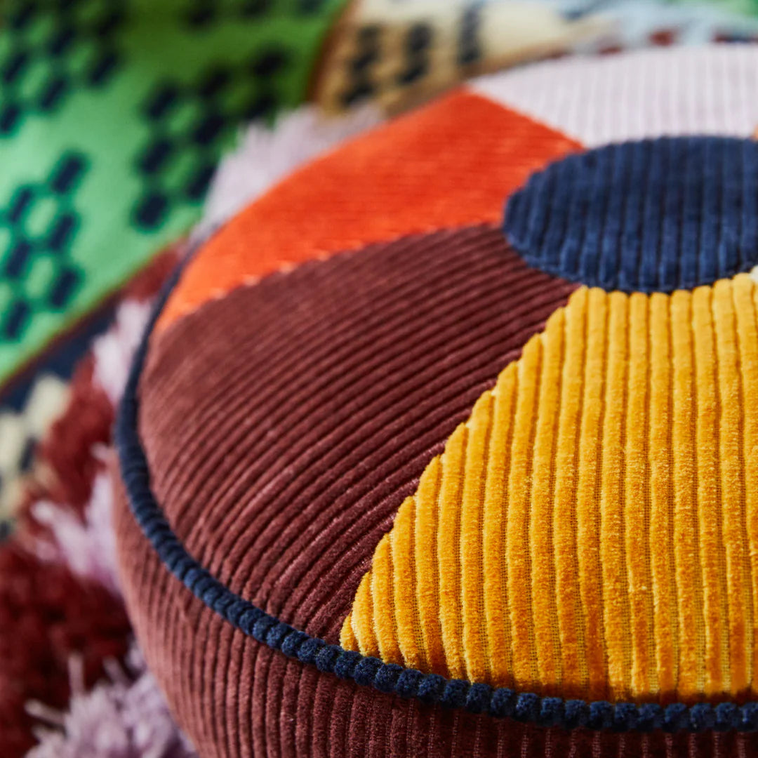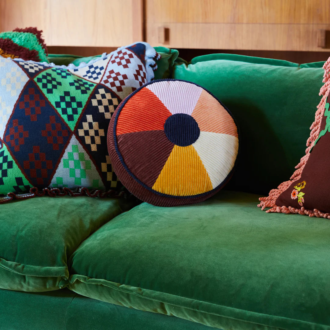 “There’s something so warm and nostalgic about corduroy, with its soft texture and ultra-homey feel. To incorporate a wide spectrum of vivid, lush colours, we’ve utilised a playful patchwork technique and double-sided design – warm tones on one side, cool on the other. Wedges of cord create a mesmerising pinwheel effect, finished with piped edges and a plush filling to tie the whole treat together.” – Phoebe’s Style Notes