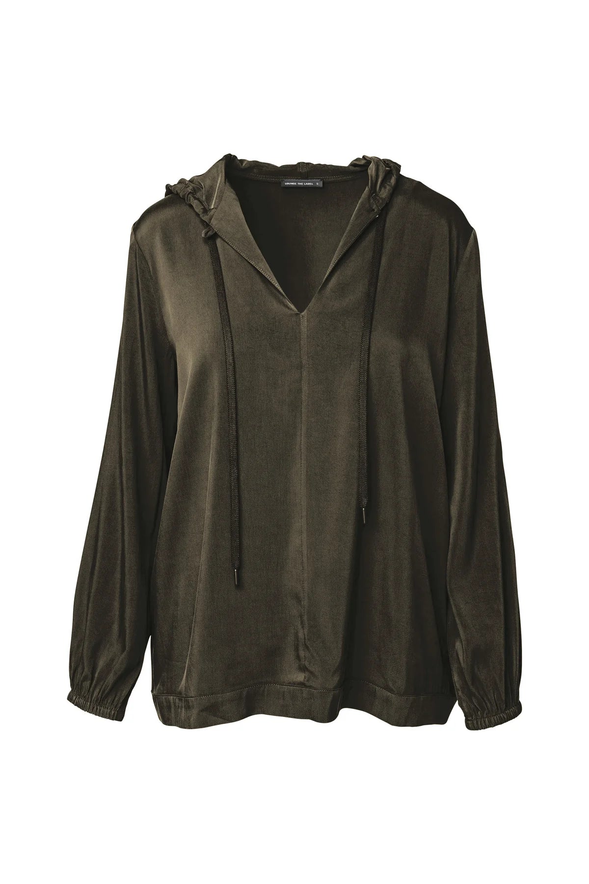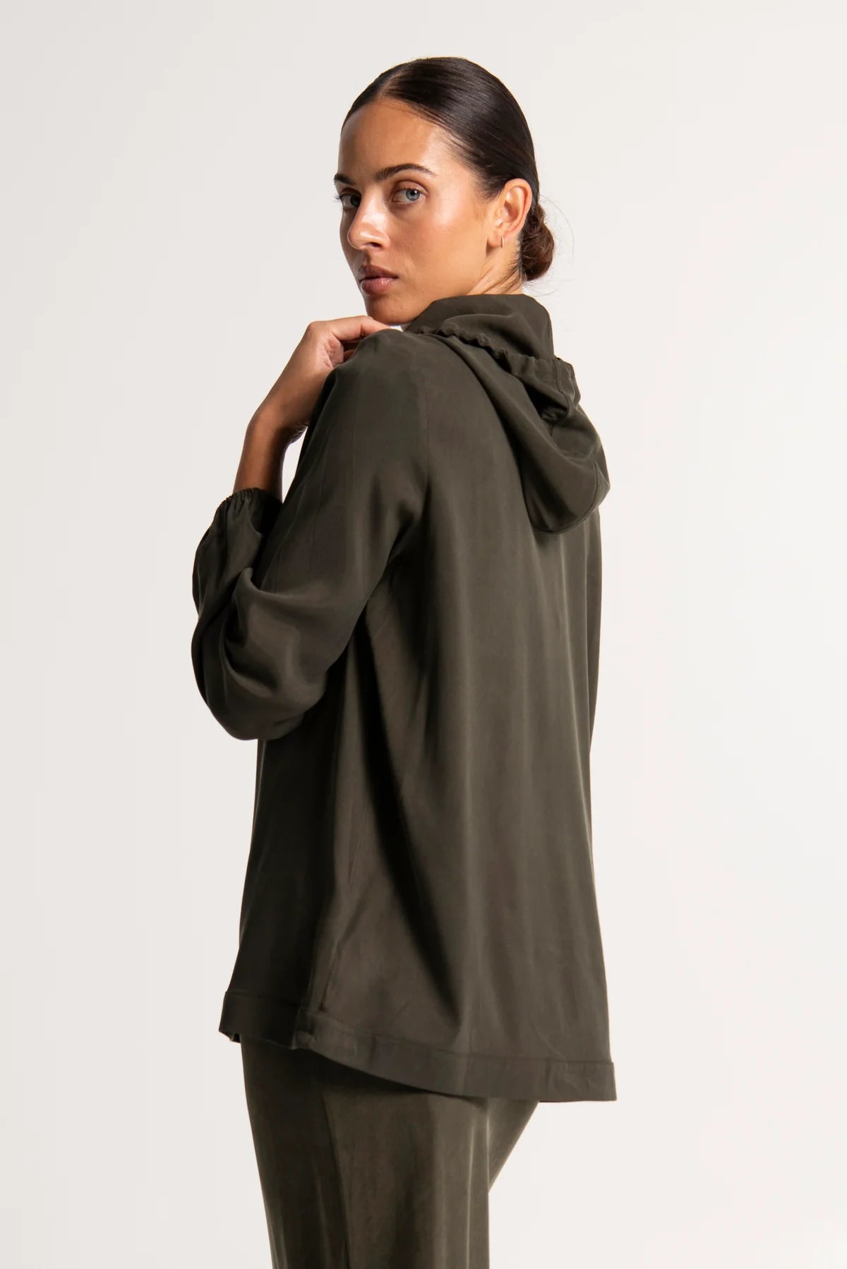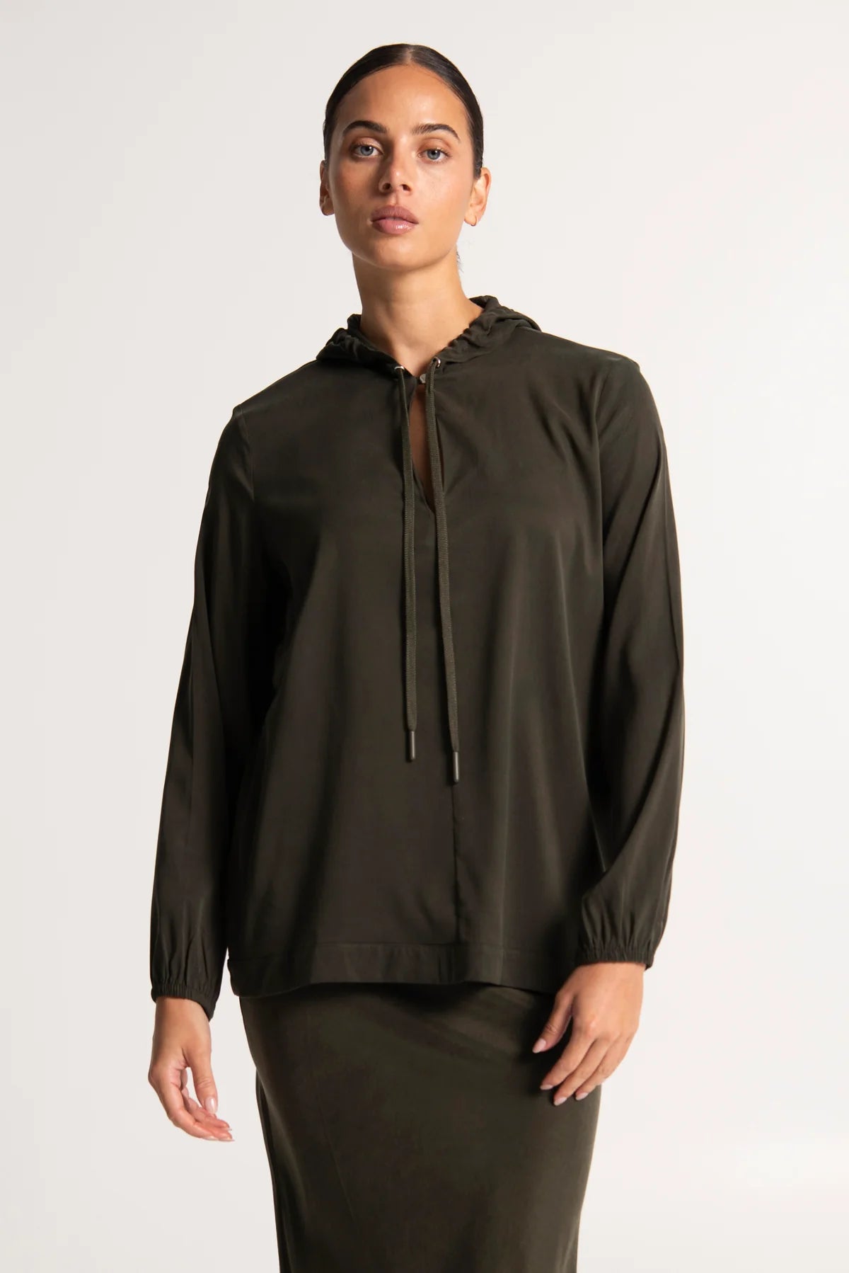 Luxe Cupro Stretch Hooded Long Sleeve Top Ducru Olive
