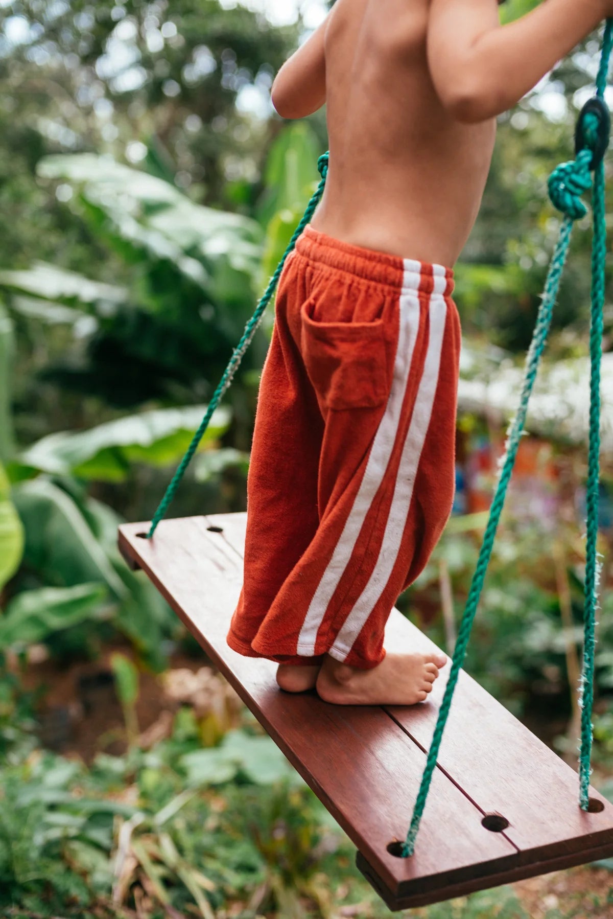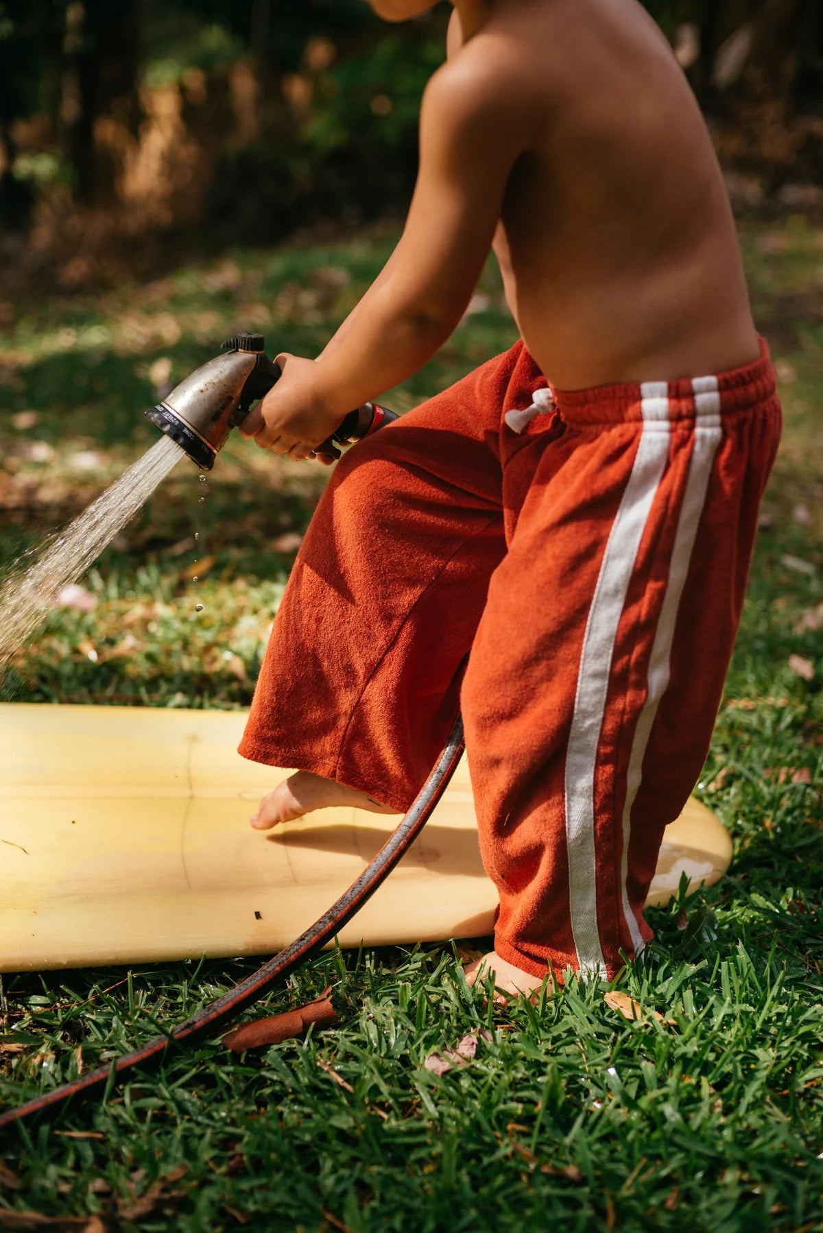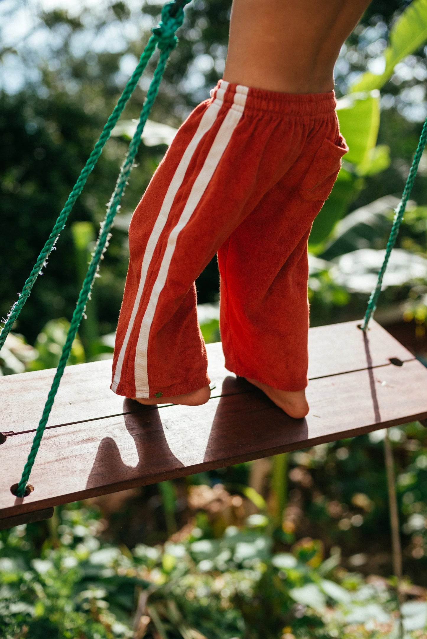 Our favourite pants are now for kids! Ready to rock n roll in the red terry toweling pants ... Let's keep this short and sweet – these pants are the bomb. Inspired by the groove of the 70s- they're made of 100% cotton, with a sporty stripe on the side, an elasticated waist with a drawstring, and a back pocket. We think these pants are perfect for any time of the day or night and are so excited to be sharing them with you!