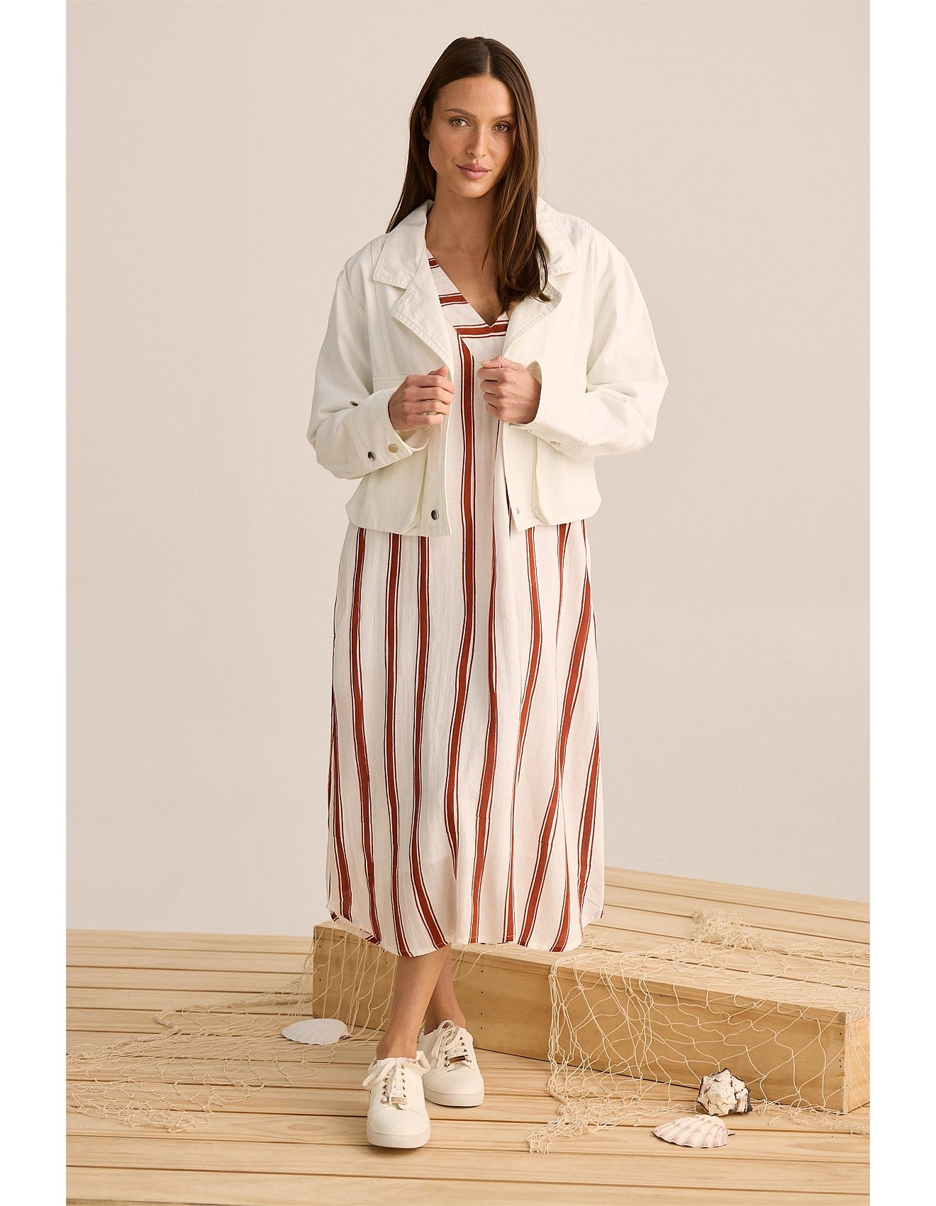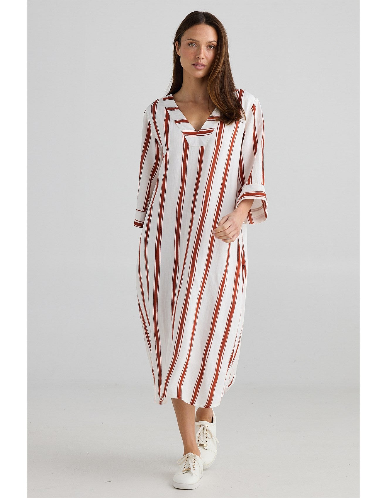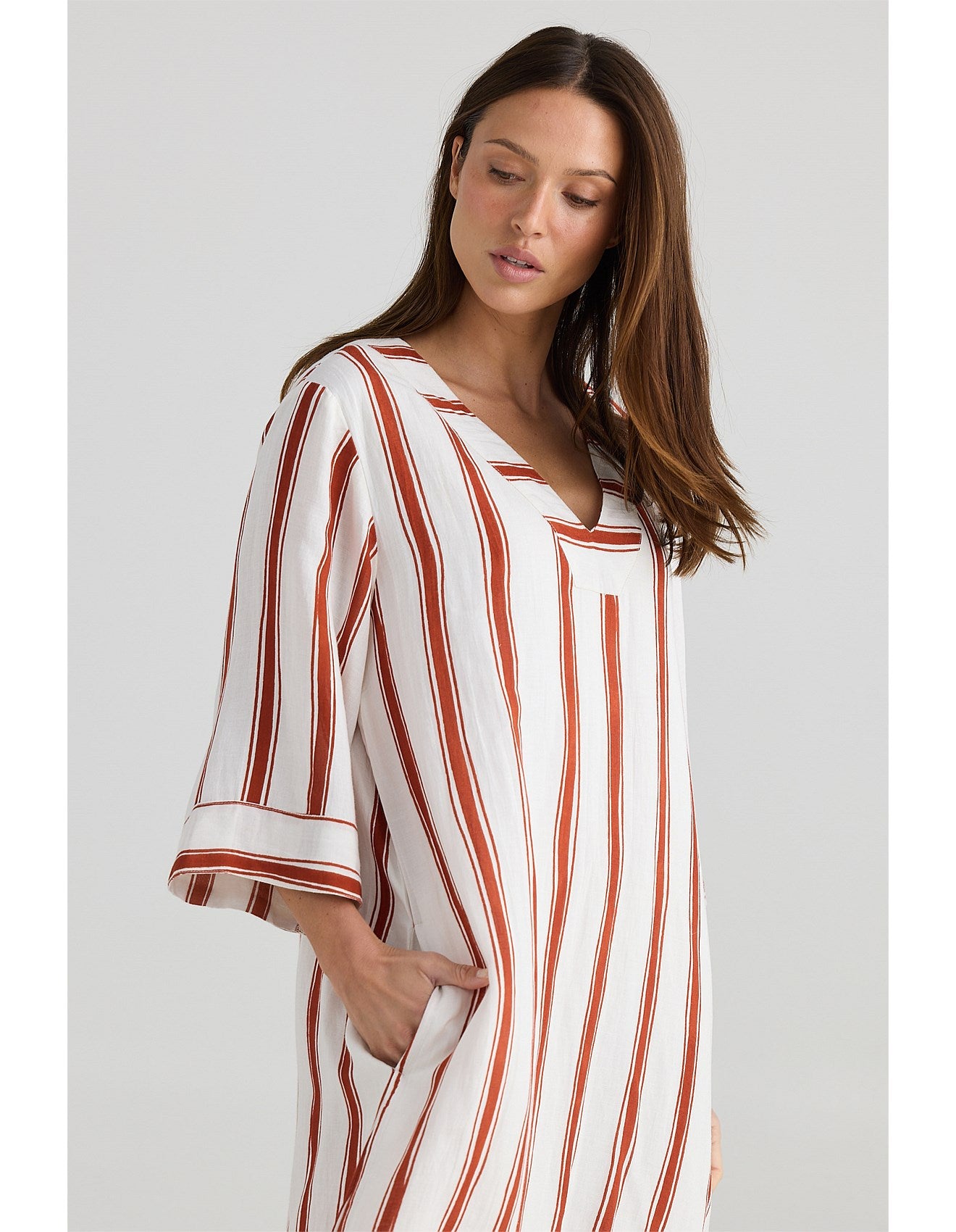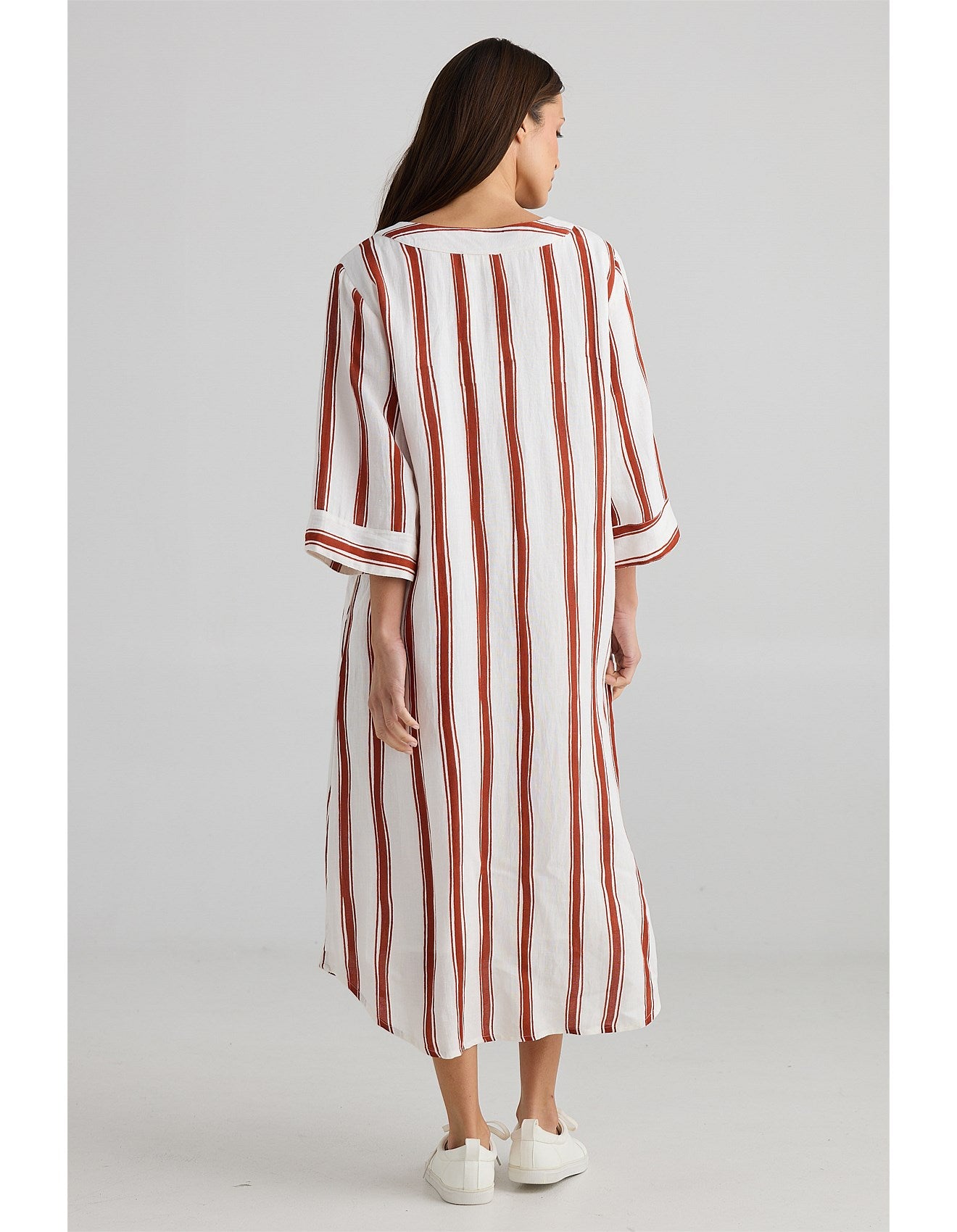 This tunic features a comfortable blend of viscose and linen, with a V-shaped neckline and contrast stripes on the V-neck and cuffs. The 3/4 sleeves and midi length add to its stylish and versatile design.