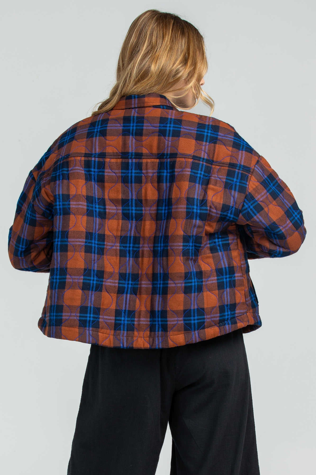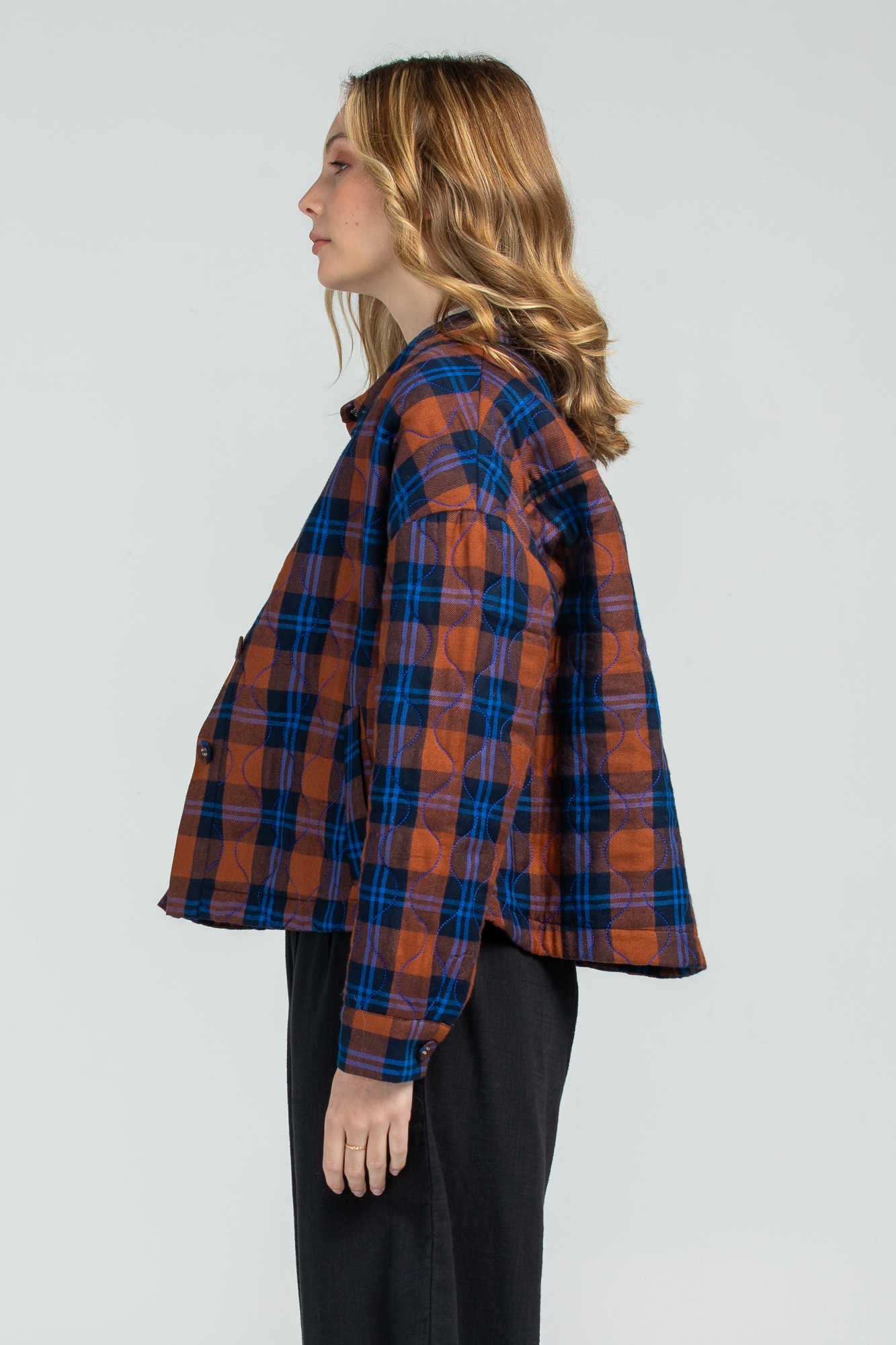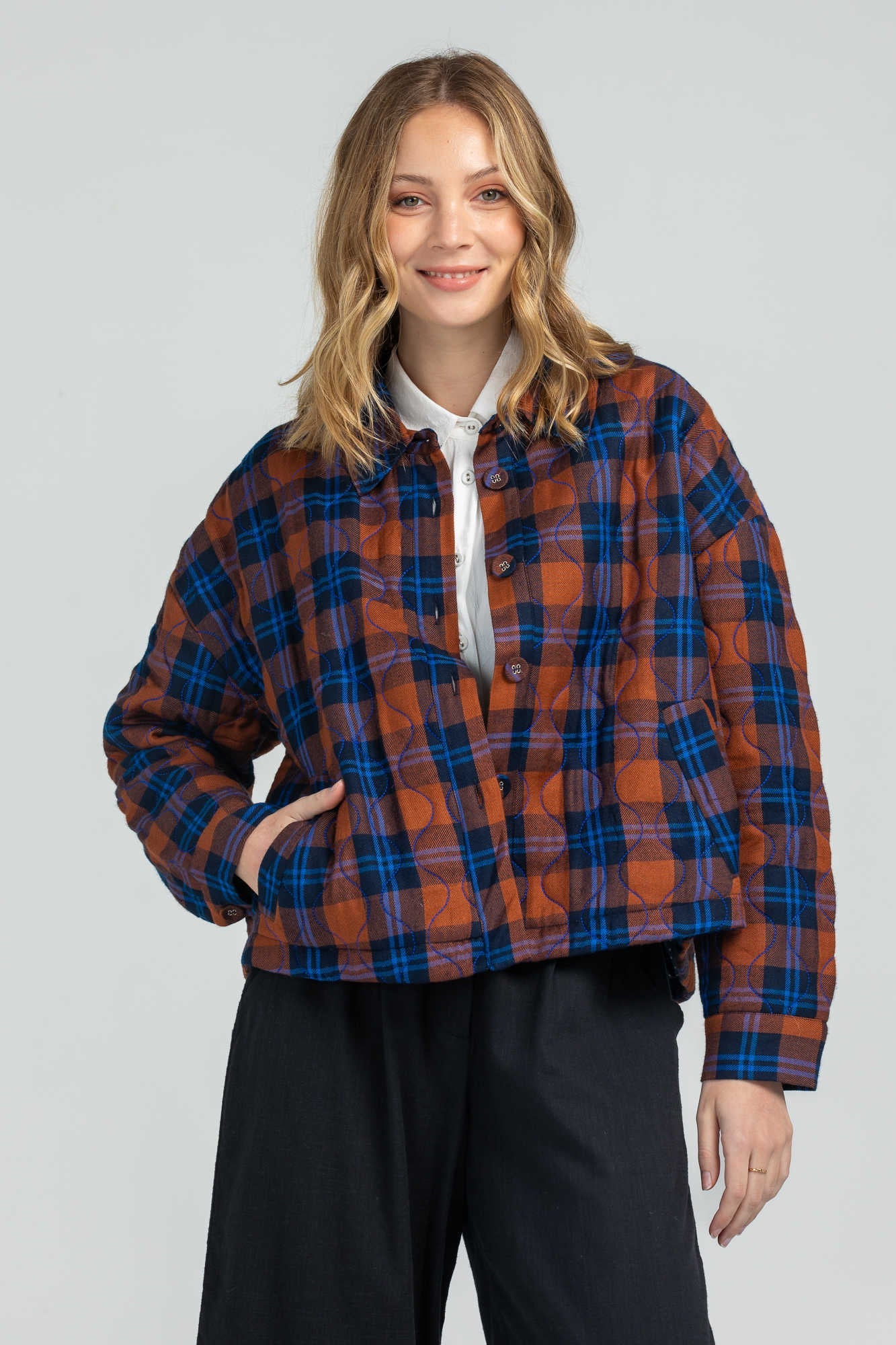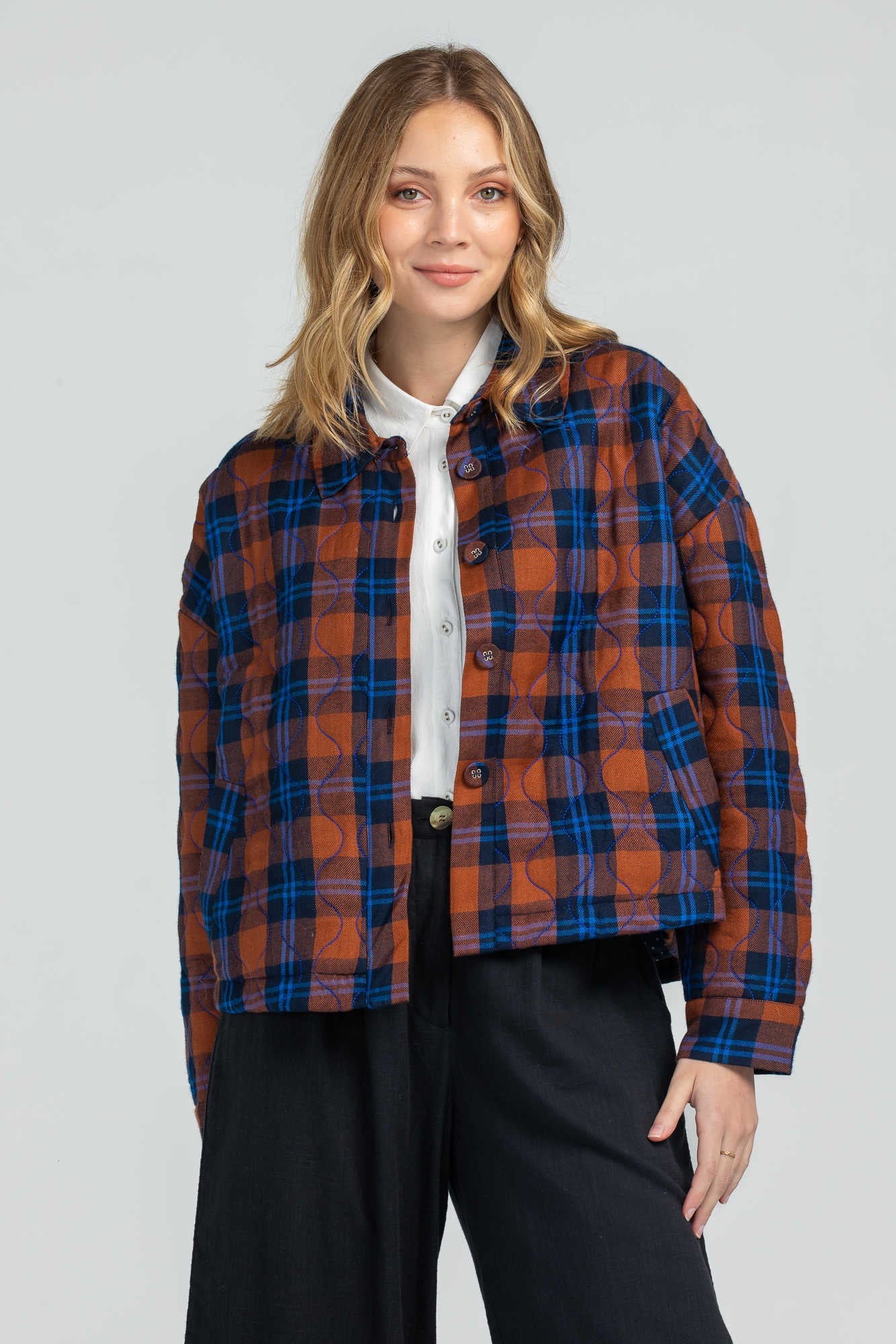 A beautiful button-front, quilted jacket from Boom Shankar. With a standard collar and front placket that hides the buttons. Featuring a super soft tartan print. Twin front pockets and cropped length - meaning this will be great with all sorts of pant or skirt styles. Team with any kind of denim.
