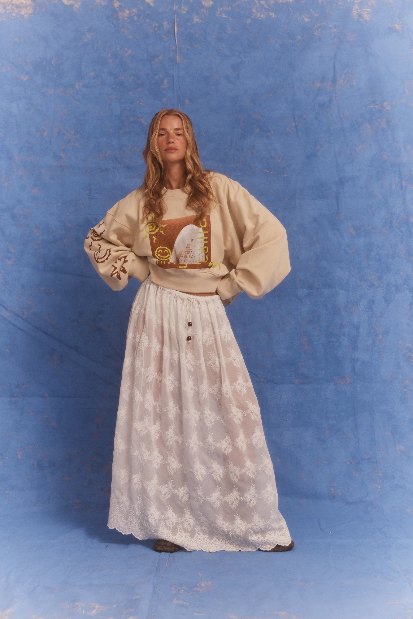 A coastal classic featuring our ultimate sun-soaked artwork - playful shells, smiley suns, and signature KC scribbles. This laidback off-white sweater is about bringing on the good vibes. It's slouchy, ultra-soft, and seriously easy to throw on over anything. Designed for days when you want to channel summer warmth, no matter the season.
